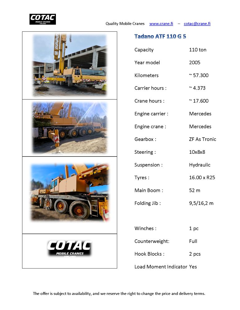 Tehokas nosturi monenlaiseen työhön! Nopea siirtää paikasta toiseen ja omaa hyvät nostoarvot verrattuna 100 tonniseen.